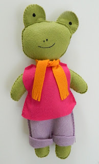 I love how perfectly imperfect they look. I found a pattern for the dog, rabbit, and mouse in Kata Golda's book Hand-Stitched Felt. And then my oldest daughter wanted a frog, of course. So, I improvised a little, I think it turned out really cute.